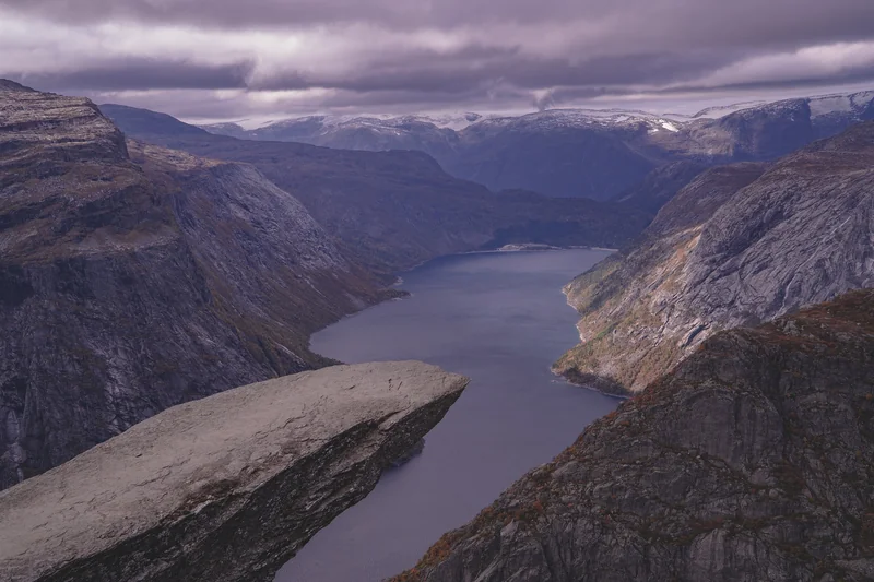 Trolltunga, czyli Język Trolla jedna z najbardziej wymagających tras w Norwegii.Znajduje się około 1100 metrów nad poziomem morza, unosząc się 700 metrów nad jeziorem Ringedalsvatne.